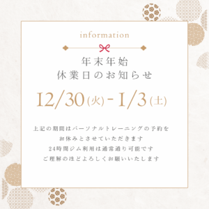 Blog記事一覧 > > 年末年始のお知らせ【2025年】 年末年始のお知らせ【2025年】 2025.11.25 | Category: 2025年年末年始のお知らせ 下記の日時休業といたします。 24時間ジム利用は通常通り利用いただけます。